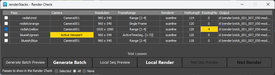 It checks all selected passes and show the result of sanity check. If it finds any potential issue, it will show as yellow text on red background.In the above image, you can see CameraC doesn’t have camera assigned and CameraB pass already has renders in the output folder.